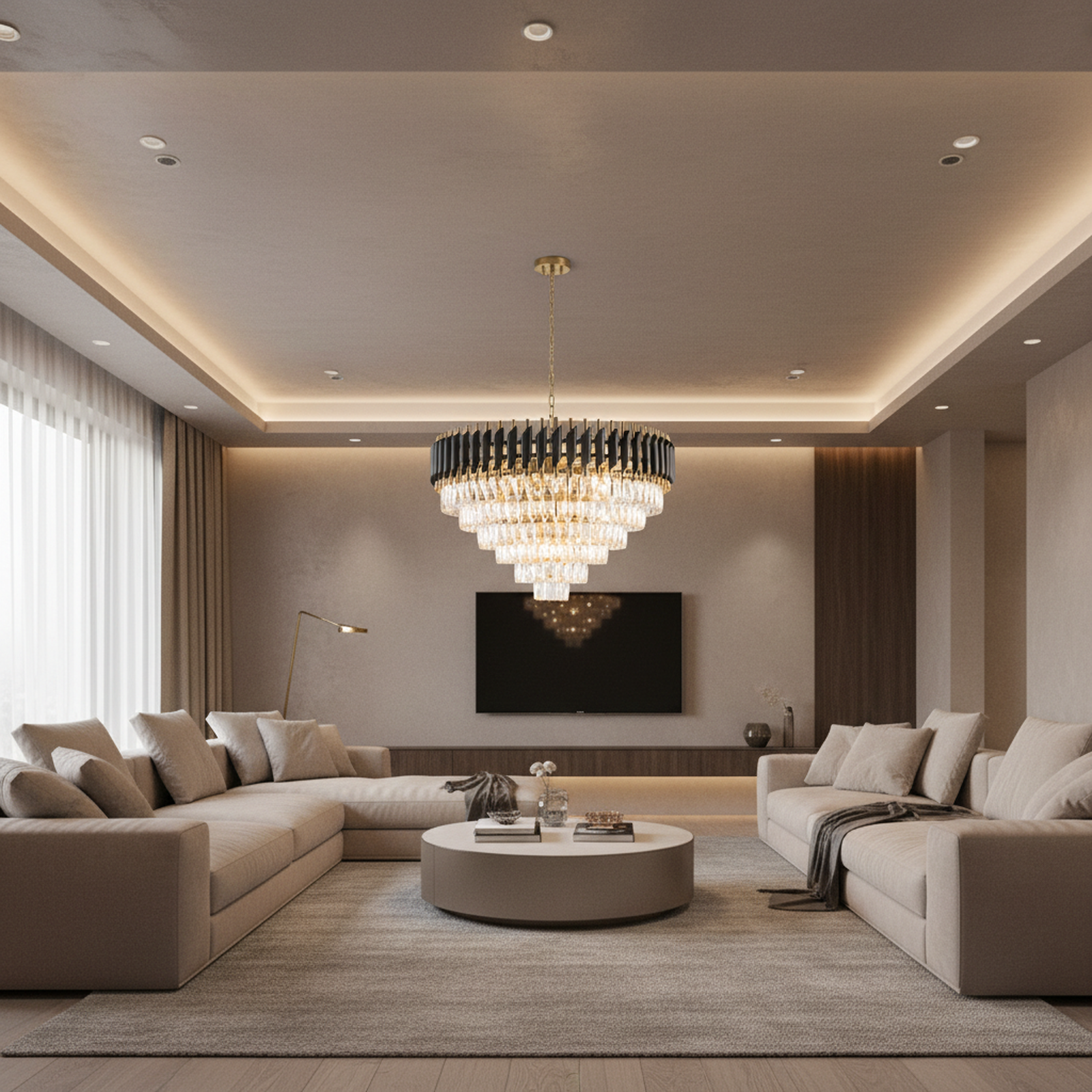 Add a touch of architectural elegance to your interiors with HARZ 5-Tier Round Modern Luxury Chandeliers, inspired by a striking crown of thorns design. Carefully crafted with multiple layers of precision-cut rectangular crystals, this chandelier creates a radiant, luxurious glow that elevates any room. It’s available in two refined finishes—black with aged brass or aged brass only—offering options that suit both bold contemporary spaces and classic luxury interiors.