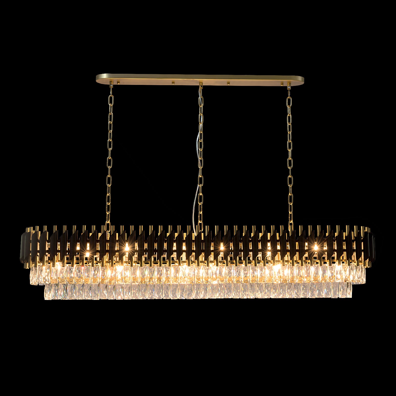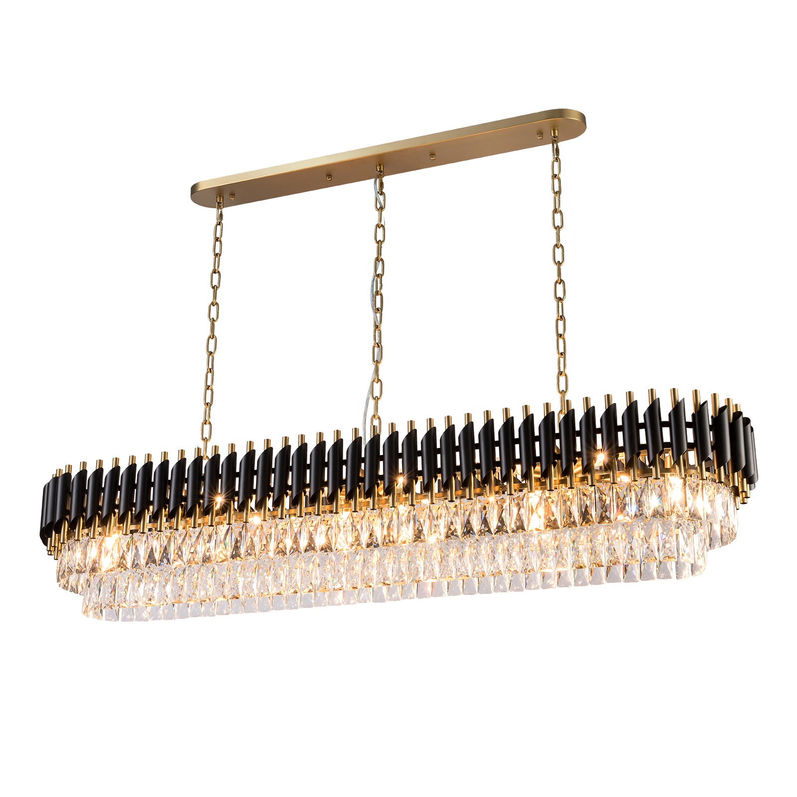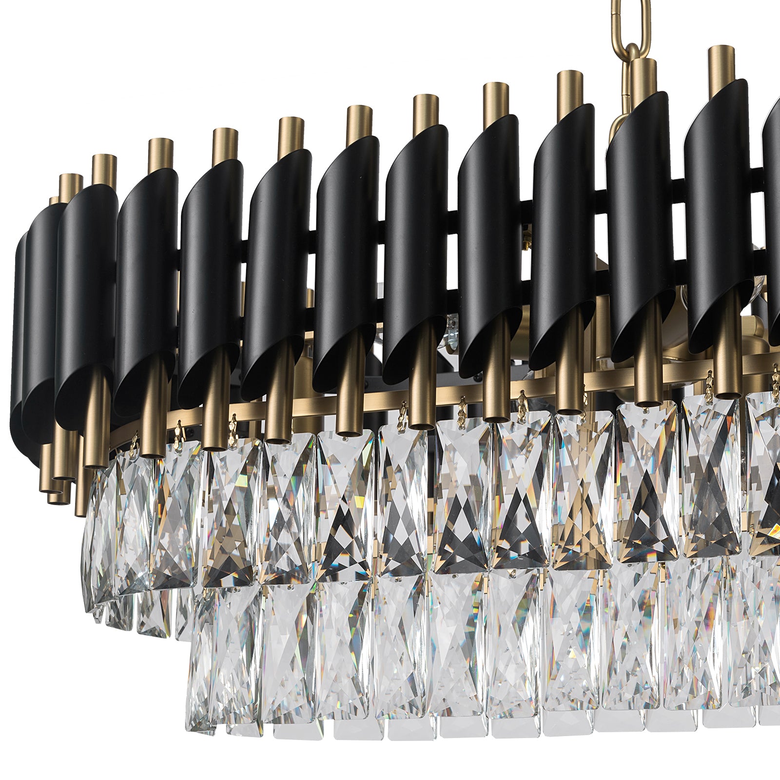 Bring luxurious sophistication to your dining area, kitchen island, or formal living space with HARZ Luxury Modern Oval Chandeliers. Inspired by a bold crown of thorns design, it features an intricate frame in either black with aged brass or full aged brass finish, paired with two layers of precision-cut crystal drops. The dynamic interplay of metal and crystal creates an opulent lighting effect that enhances both modern and classic interiors.