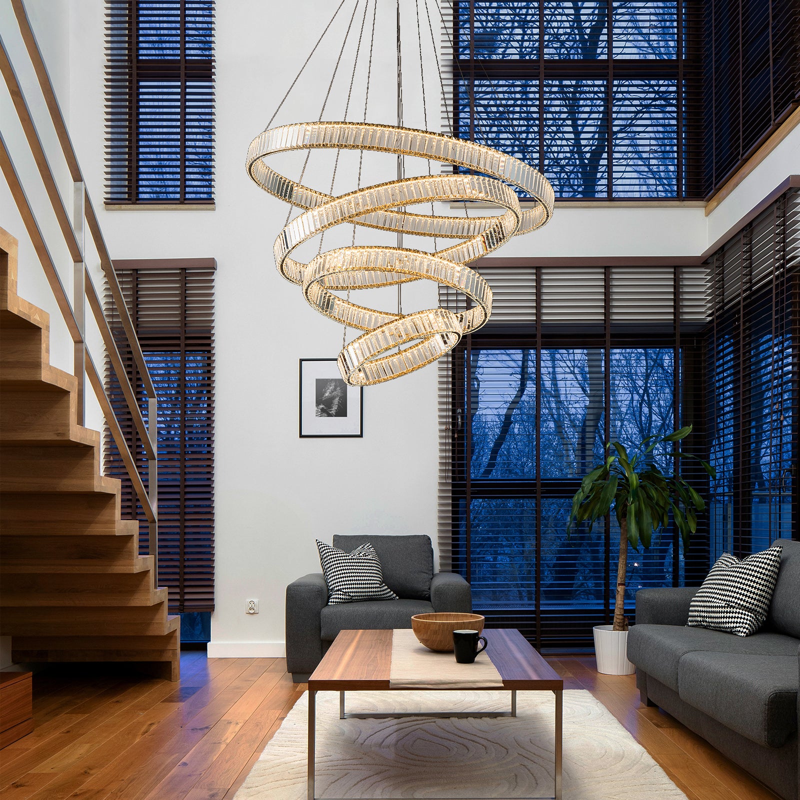 Elevate your interior design with the RING 4 Layer Modern Crystal Chandelier, a masterpiece of illumination that blends breathtaking artistry with advanced functionality. This spectacular pendant light features four graduated tiers of circular LED frames, elegantly adorned with a spaced band of faceted calcite prisms. Choose from a sophisticated Chrome or timeless Aged Brass plated finish to perfectly complement your luxury decor.