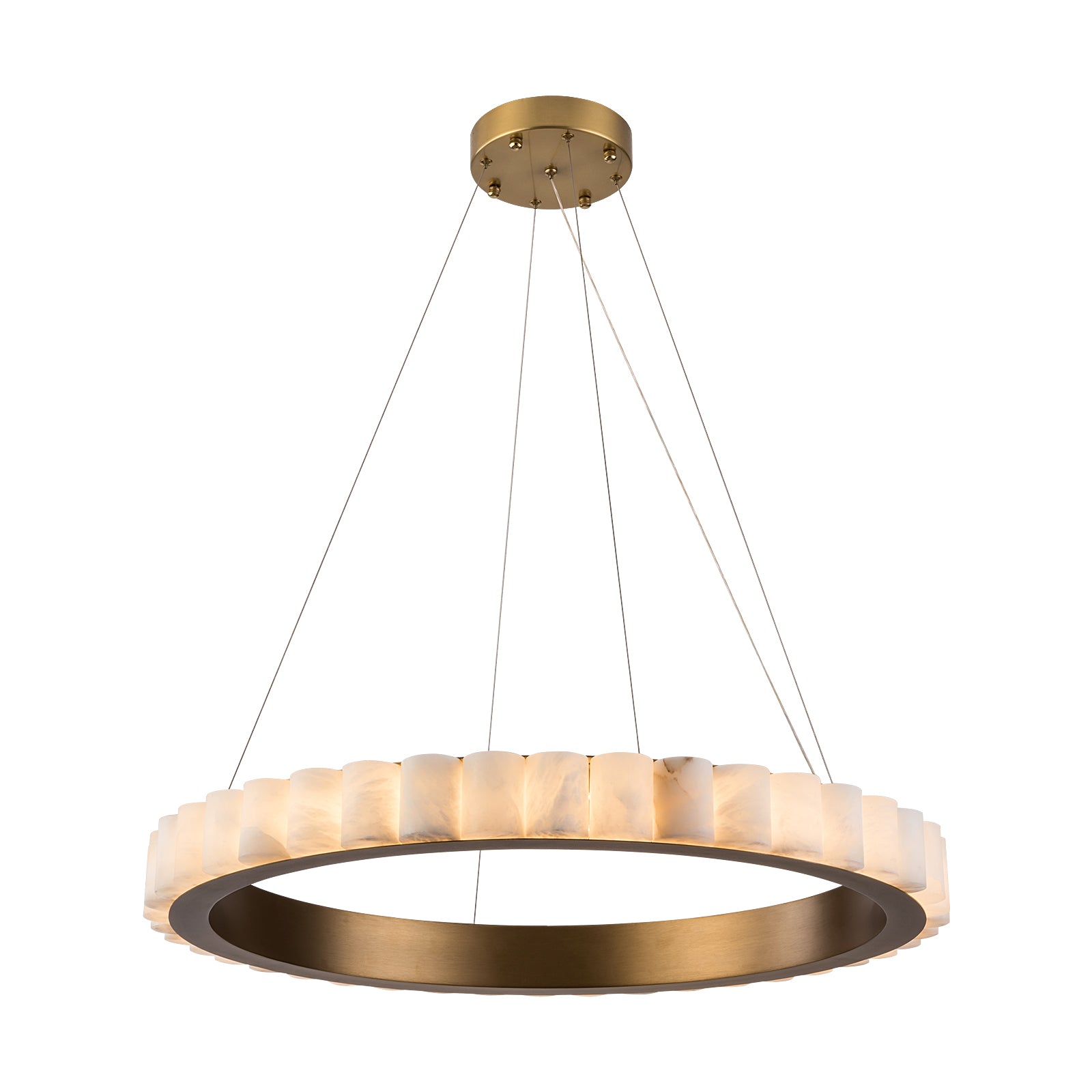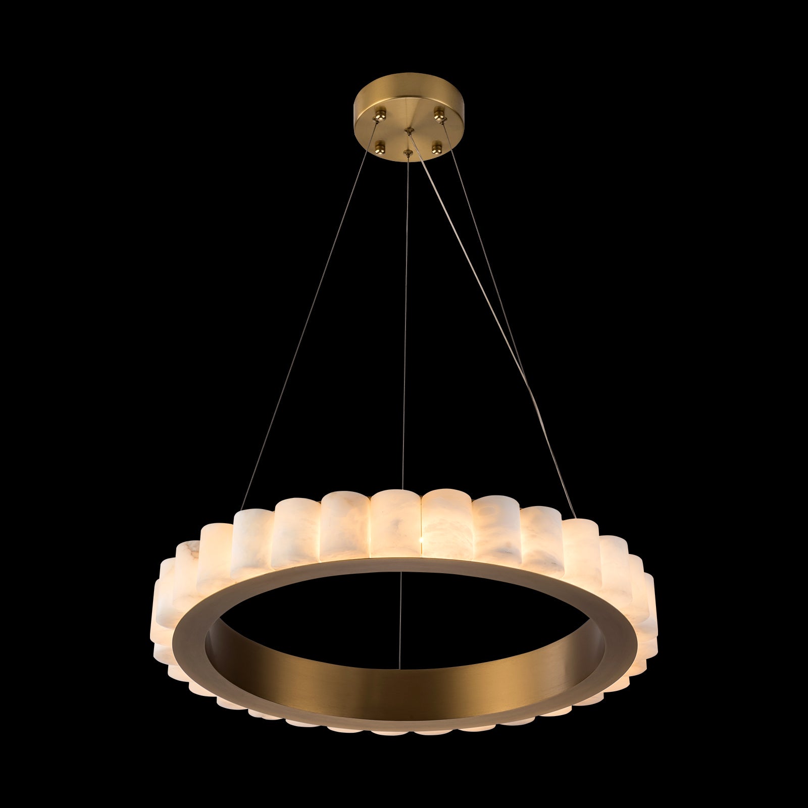 JASPER Modern Style LED Alabaster Stone Chandelier presents a refined balance of luxury and natural warmth, built around a metal circular frame wrapped in a continuous band of premium alabaster stone. The golden metal finish gives the fixture a modern, upscale presence, while the translucent alabaster diffuses light into a soft, ambient glow. Its floating suspension system, supported by four slim cables, enhances the ring’s clean geometry and creates an elegant, weightless silhouette suitable for contemporary interiors.